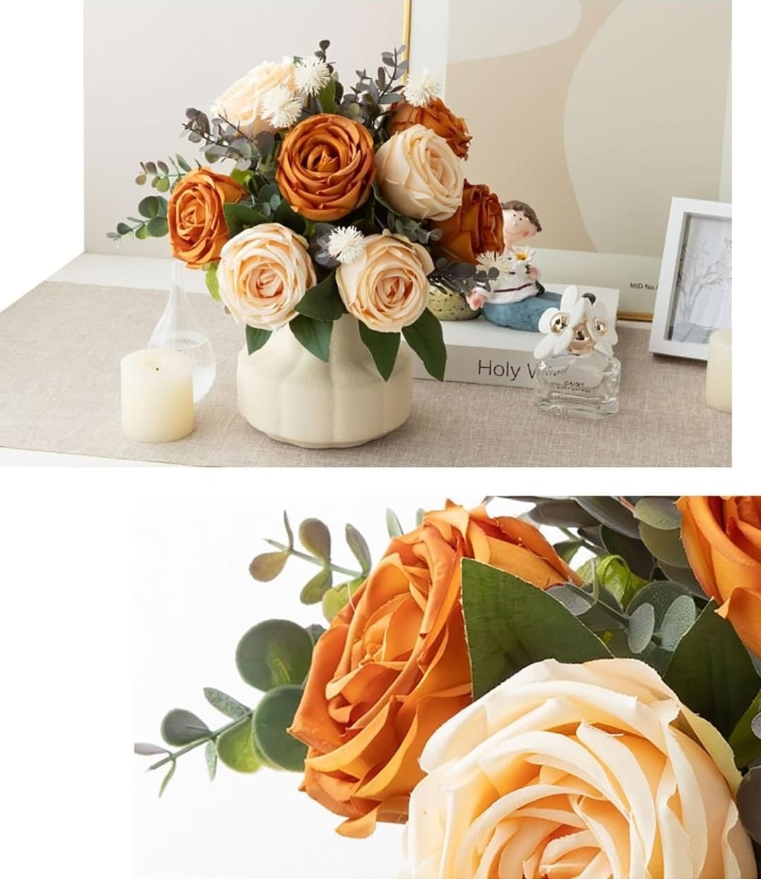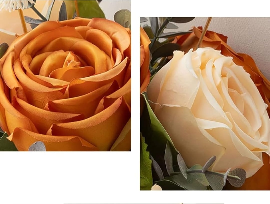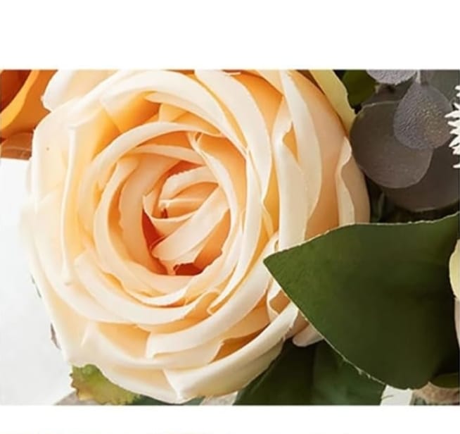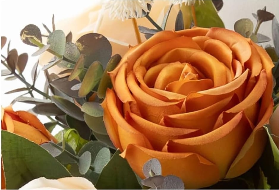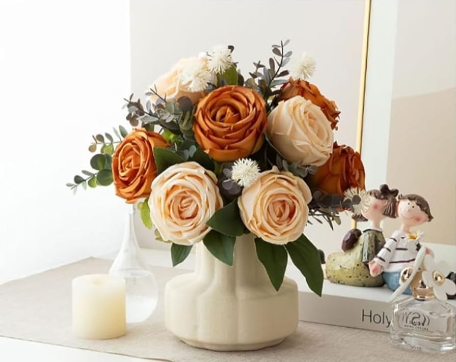 This elegant bouquet features lifelike faux roses in warm amber and soft cream hues, paired with delicate white blooms and eucalyptus accents. Set in a modern ivory vase, it brings a cozy, timeless charm to any space perfect for brightening your home or gifting serenity to someone special. No watering needed just lasting beauty and peace.